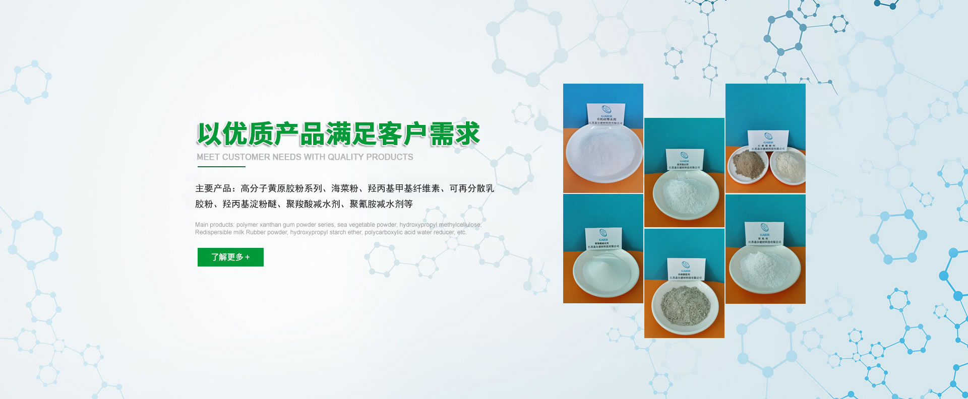 2008年高分子黃原膠粉自主研發(fā)成功,相繼研發(fā)銷(xiāo)售產(chǎn)品有:流變穩(wěn)定劑、粉末消泡劑、有機(jī)硅憎水劑、憎水乳膠粉、滲透結(jié)晶活性母料、粉末聚乙烯醇、塑滑劑、高分子潤(rùn)滑劑、改性觸變劑、聚羧酸減水劑、三聚氰胺減水劑、快硬膨脹劑、塑性膨脹劑、水泥基緩凝劑、鋰基促凝劑、石膏緩凝劑、返稠抑制劑、可再分散乳膠粉、400粘度纖維素醚、2-20萬(wàn)粘度纖維素醚、膩?zhàn)痈男岳w維素、預(yù)拌砂漿改性纖維素、輕質(zhì)抹灰改性纖維素、石膏砂漿專(zhuān)用纖維素、輕質(zhì)抹灰專(zhuān)用膠粉、石膏基自流平母料、水泥基石膏基輕質(zhì)/隔音墊層自流平母料,水泥自流平母料、道路快速修補(bǔ)母料、灌漿料母料、壓漿料母料、水下不分散砂漿母料、EPS線條抹面砂漿母料、輕骨料砂漿專(zhuān)用膠粉、海菜粉、速溶型增稠劑粉末、羥丙基淀粉醚、混凝土早強(qiáng)劑、聚丙烯抗裂纖維、木質(zhì)纖維等功能型母料助劑。